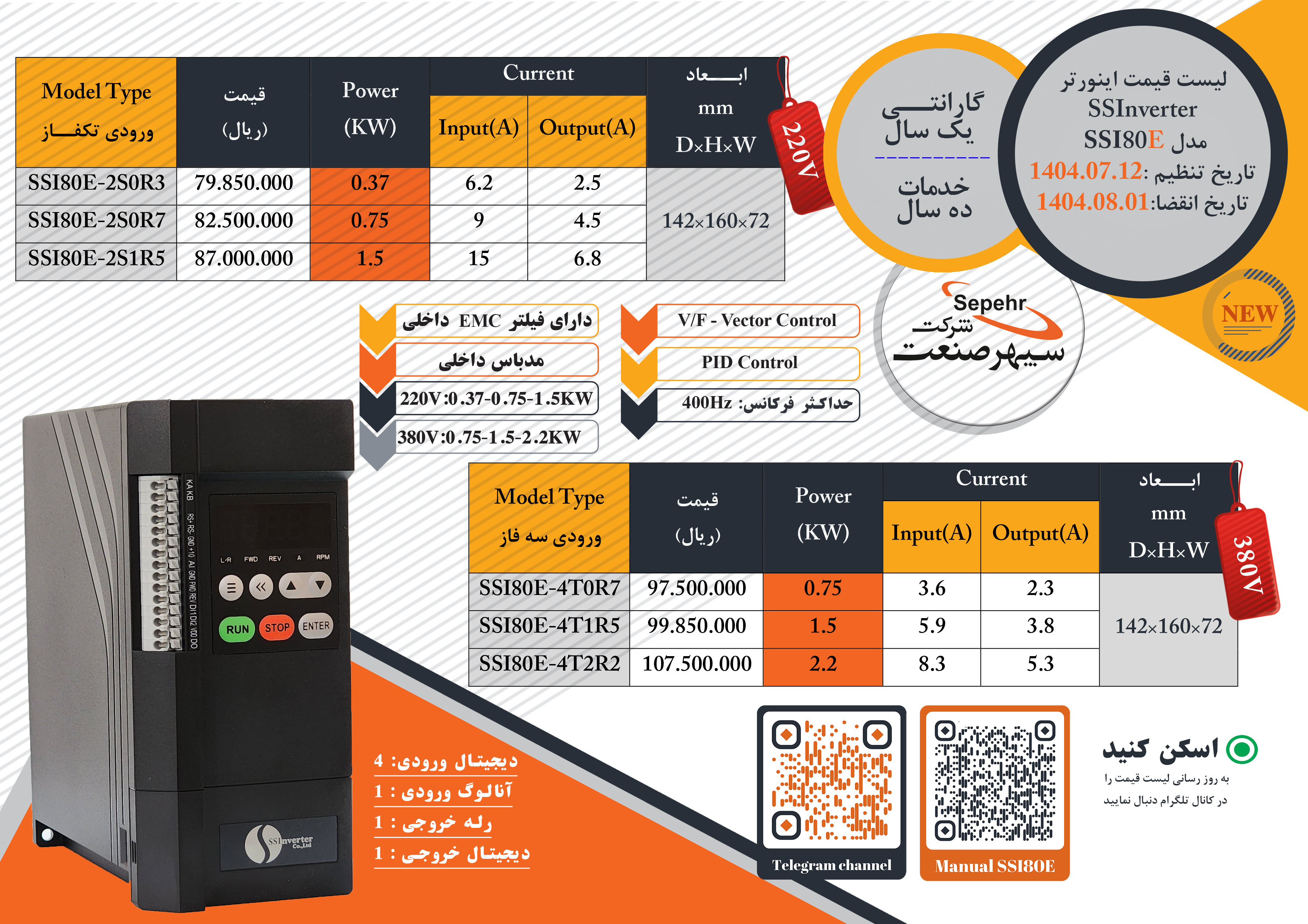 اینورترSSI80E که از تیرماه 1403 در سبد محصولات SSInverter آورده شده است هم خانواده SSI80 می باشد با کیفیت برابر اما قابلیت های محدودتر برای متخصصینی که به دستگاه عمومی تری نیاز دارند.